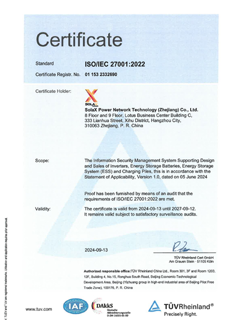 SolaX duy trì các tiêu chuẩn cao nhất về quản lý chất lượng, độ an toàn và độ tin cậy thông qua các chứng chỉ được quốc tế công nhận. Chúng tôi có hệ thống kiểm soát chất lượng nghiêm ngặt, đảm bảo mọi sản phẩm đều đáp ứng quy định khắt khe trong ngành và mong đợi của khách hàng. SolaX cam kết cung cấp các giải pháp năng lượng mặt trời đáng tin cậy, hiệu suất cao cho một tương lai bền vững.